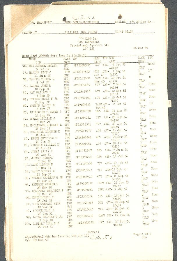 Jodi provided the following pictures including a copy of the ship manifest that bears his name. Ron sailed on the General Maurice Rose from Fort Dix, New Jersey on December 26, 1950 and arrived in Southampton on January 6th, 1951. Official number TAP126.